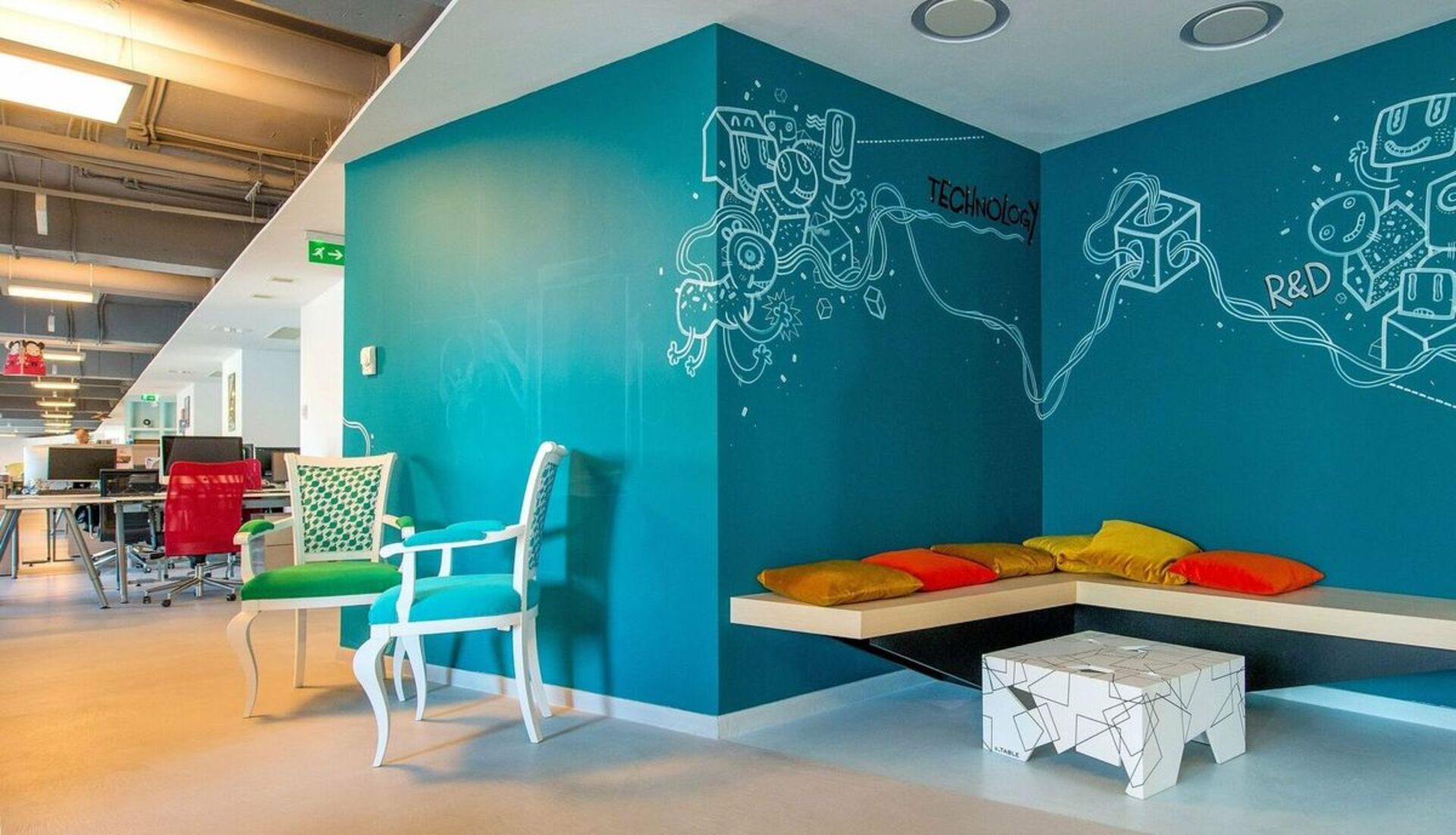 Из стандартных офисных стульев, маленького столика и недорогих аксессуаров можно создать уютный уголок для кофе-пауз. Добавьте пледы, подушки или настенные постеры, чтобы зона стала действительно привлекательной.