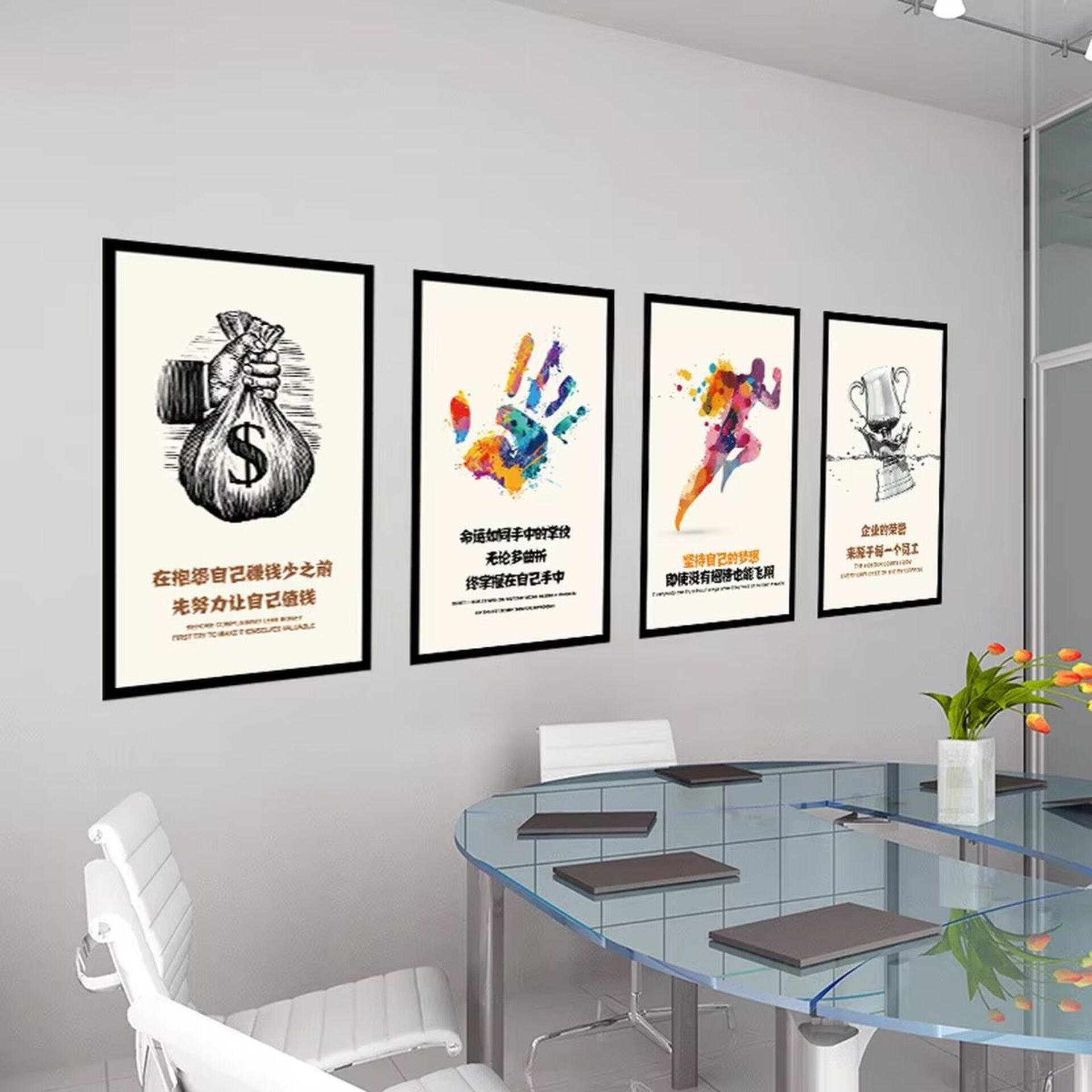 Постеры, картины, фотографии коллектива или даже доска с картой мира – неплохая идея для оформления стен. Вы можете распечатать изображения сами и вставить их в обычные рамки.