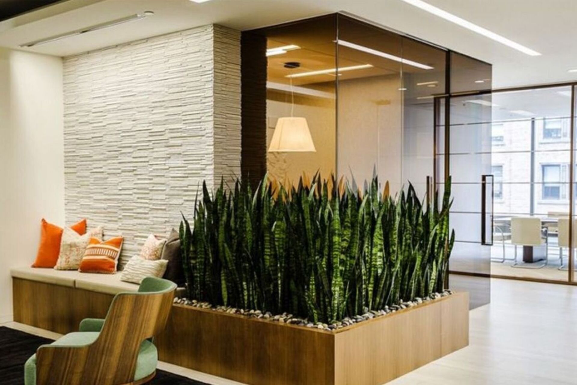 Оживить приемную зону и создать расслабляющую атмосферу для посетителей и сотрудников помогут живые растения или стабилизированных мох. Они не только смогут украсить ваше пространство, но и, как показали исследования, могут улучшить качество воздуха, снизить уровень стресса и повысить производительность.