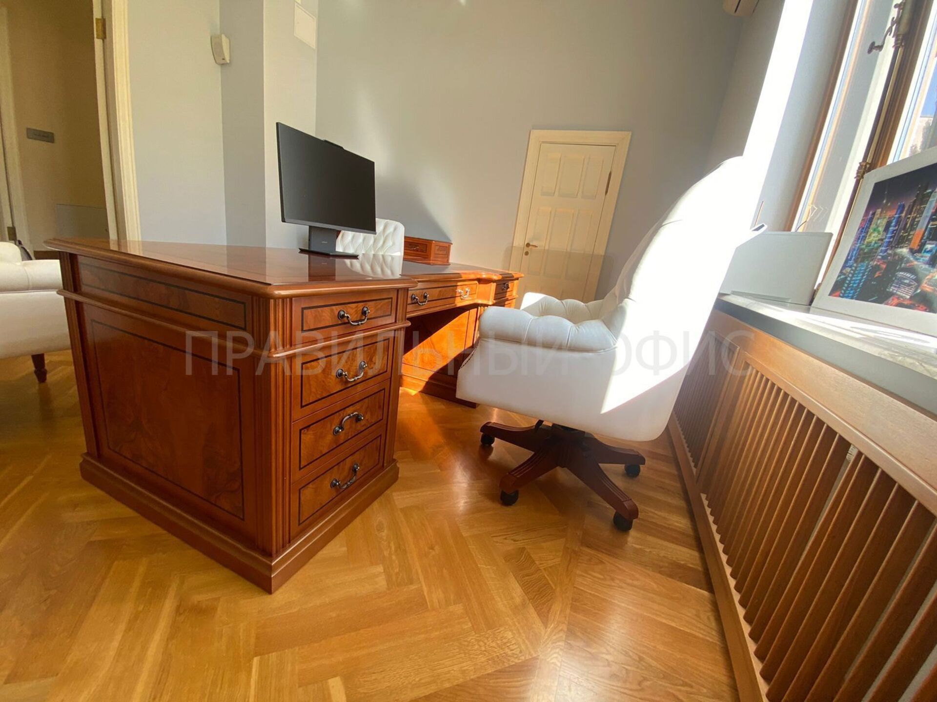 Кабинет руководителя PRIVILEGE — это воплощение утонченной классики и подлинной роскоши. Её дизайн, основанный на безупречных пропорциях и гармонии форм, говорит о статусе своего владельца красноречивее любых слов. В данном проекте уникальный характер кабинету придает использование редкого и благородного материала — натурального шпона корня оливкового дерева насыщенного янтарного оттенка. Неповторимый рисунок древесины, подчеркнутый многослойным лаковым покрытием, делает каждый элемент мебели по-настоящему уникальным арт-объектом.