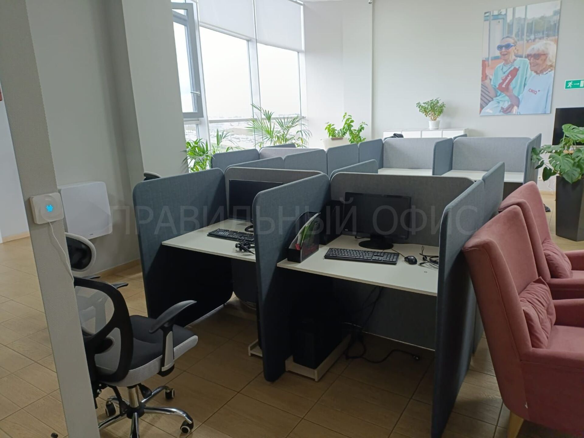 Было обустроено 12 рабочих мест для сотрудников технической поддержки, используя серию мебели для Call-центров в белом цвете ЛДСП в сочетании с разными оттенками мягких тканевых перегородок (Romeo-10 и Romeo-13).